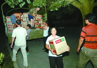同一时间,市民政局的210箱矿泉水和2吨饼干也抵达了北仑白峰镇,很快分发到各个灾民手中。