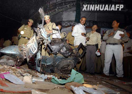 10月29日,印度警察在首都新德里的爆炸现场进行勘查。当天,新德里发生系列爆炸,造成至少16人死亡,60多人受伤。