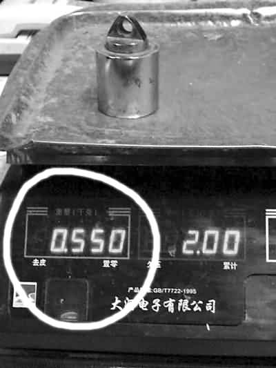中国宁波网讯 (记者张燕通讯员徐蓉)一个500克重的标准秤砣,放在电子秤上居然有550克。用这样的电子秤卖菜,吃亏的当然是老百姓。昨天下午,镇海工商部门联合行动,收缴了一批被做过“手脚”的电子秤,因此类秤具称物时会导致短斤缺两,俗称“九两秤”。