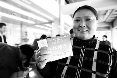 图为一名外来务工者高兴地向记者展示刚刚领取到的免费体检卡。记者刘波图