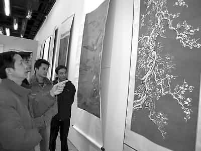昨日,西泠印社在宁波美术馆展出如今屈指可数的宁波籍明代宫廷画家吕纪的画作《芙蓉芦雁图》和张大千81岁时献给爱妻的礼物《十二月令花卉册页》,这两幅画作均为上乘精品,难得一见。据悉,这是两位宁波籍收藏家出于对故乡的热爱,特意将祖传珍品托西泠印社捎来宁波,让家乡人民一饱眼福的。图为人们正在参观《芙蓉芦雁图》。(记者南华摄)