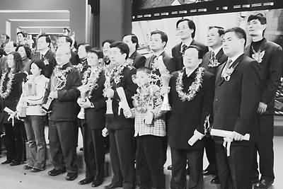 2300名市民的代表彭洪升(图中举奖状者)和张健(左二)在领奖台上。摄影张柯