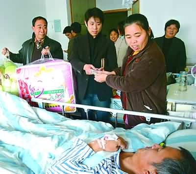 图为张才连妻子在医院感动地接过一位企业主带来的捐款。 (陈邦强 摄)