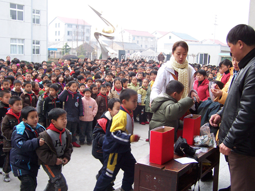 中国宁波网讯 1月11日上午,舒家小学校园内,全校师生把一张张、一枚枚满载着对四(1)班贫困学生张兴艳关爱的纸币、硬币投进爱心捐款箱。当天下午,班主任林路薇老师将500元慰问金送到了正在奉化中医院住院的张兴艳手中。据介绍,该校打算成立专门资助贫困学生的爱心基金会,以让家境贫寒的学生继续完成学业。 (记者王于奎 通讯员包雪波)