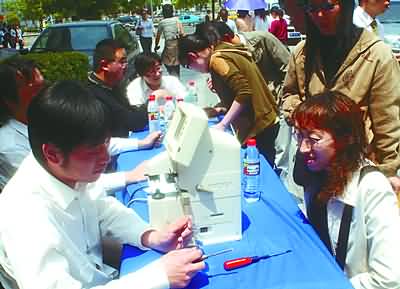 中国宁波网讯 昨天,宁波市质监局计量测试所团员青年在中山东路摆开了“迎五四”为民服务摊,为群众免费检测眼镜度数、杆秤,并分发体温表等用品。据悉,此类公益服务该所的团员青年已坚持多年。(周建平王力敏摄)