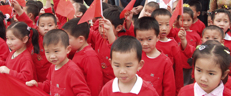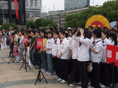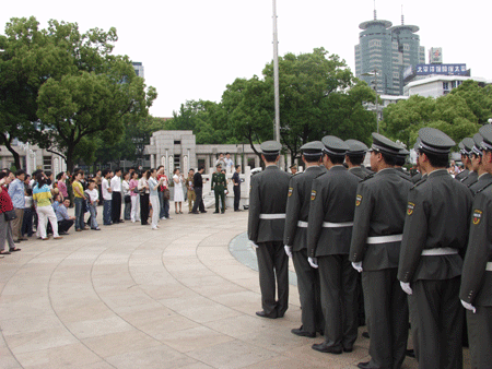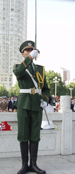 7点59分,国旗护卫队威武的身姿出现在市政府正大门,他们列成方队,护卫着国旗,迈着矫健的正步迈入升旗场。8点整,《义勇军进行曲》响起,只见,升旗手握着国旗一角,飒爽一挥,鲜艳的五星红旗徐徐升起。此刻,孩子们不约而同地向国旗敬少先队礼,而数千名群众则向国旗行注目礼,国歌声被越唱越响,也越飘越远……