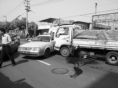 4月29日上午9时许,在江东北路一出租车转弯时与卡车相撞,幸无人员伤亡。记者江涛通讯员周杰摄