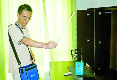 | 检测人员用仪器检测房间内的甲醛含量。记者 孙肖 摄 |