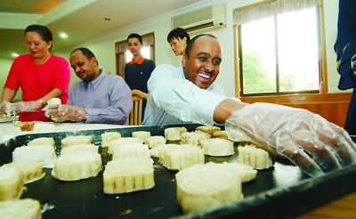 昨天下午,江北文教街道繁景社区特地请来高级面点师,向外籍居民传授月饼的制作方法。 吃了自己做的月饼后,外籍人士都赞不绝口:“月饼OK!” (徐佳伟黄敬文)