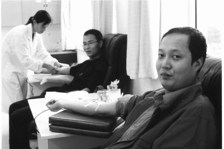 中国宁波网讯:近日,天安集团工人邱勇与陈光分别接到县献血办求援电话,请求速去县人民医院献血,以抢救因车祸急需输AB型血的伤员。两人就立即赶赴县献血中心,各献了400毫升。(励明登摄)