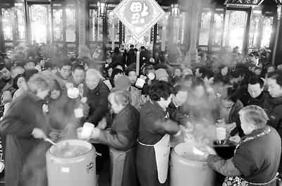 今天清晨6点多天还没完全亮,上千市民在月湖边的居士林戏台前排起了几百米长的队,等候领取免费派发的腊八粥。