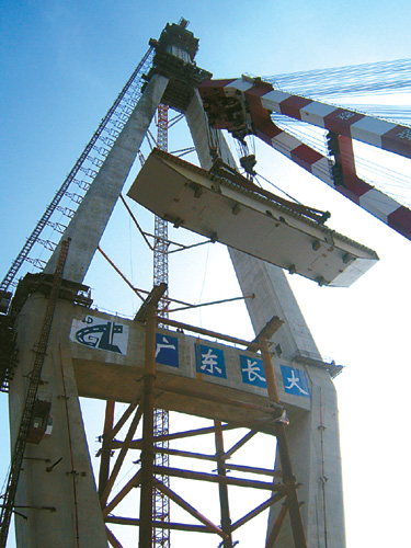 北航道桥距北岸约3公里,为双塔双索面钢箱梁斜拉桥,通航能力3.5万吨。为保证大型船只通过,主跨通航孔宽度达448米,净高度47米。在此条件限制下,只能采用钢索斜拉桥型,钢索一端连接高达178米的两座桥塔,一端连接桥面箱梁。根据这一设计方案,混凝土箱梁已不适用,而必须采用钢箱梁。图为首段钢箱梁正吊向主塔。