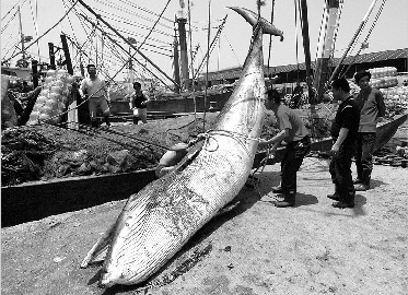 市海洋与渔业局专家林先生说,鲸鱼一般在黄海和南海比较多见,东海很少见,被误捕的概率就更低了,他判断这条鲸鱼是小须鲸,小须鲸一般长约6到8米。