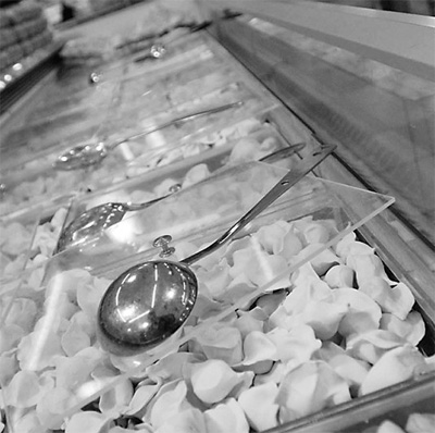 记者昨日在天一商圈附近一家超市的冷冻食品柜边,一个中年妇女边用铁勺搅着散装水饺,边神情激动地与同伴聊天,唾沫星子飞溅;另一位男士估计是想知道水饺是什么馅,随手拿起一只水饺闻了闻,摇摇头把水饺扔回去。