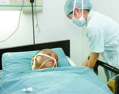 图2:徐义胜在市第二医院烧伤中心隔离病房抢救。(记者胡建华摄)