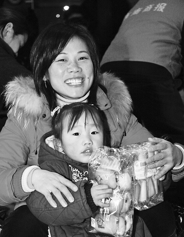 一对母女开心地接过面包。记者刘波摄