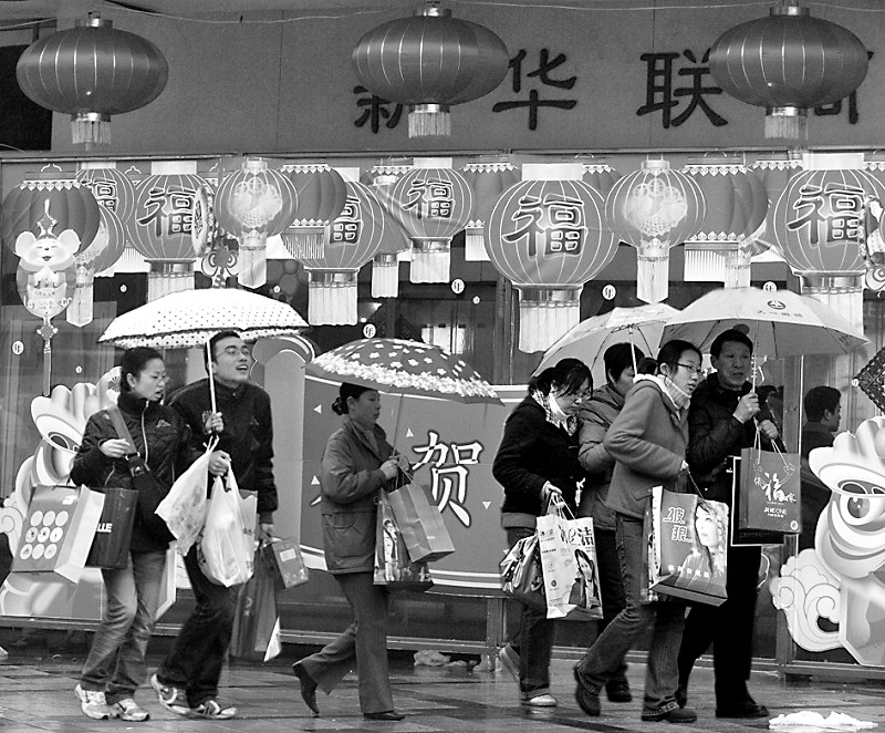昨天下午,甬城街头到处挂满了吉祥 “福”字和新春年画等迎春饰品,各家商场也迎来了节末的购物热潮。