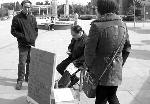 昨日上午,江东一家纺织企业的工作人员正在火车南站广场招聘企业员工。春节过后,我市一些工厂企业纷纷开工,急需大量的劳动力,以满足企业用工需求。但这样设摊招聘企业员工违规。有关人士提醒外来务工人员,找工作要到正规的市人力资源市场去。 (本报记者摄)