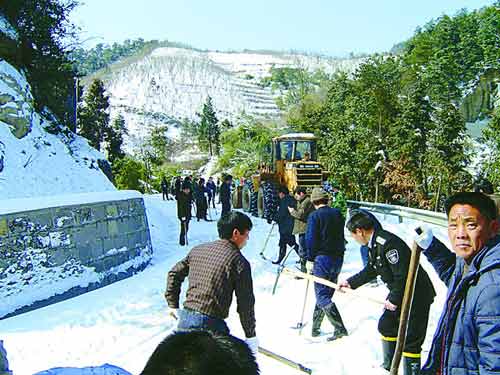 图2:四明山镇的干群正在盘山公路上破冰开路。