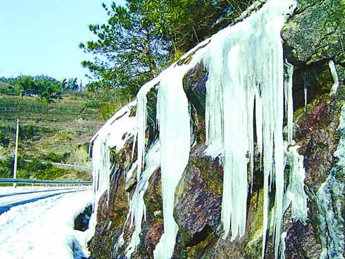 图5:虽然气候转暖,但在四明山镇的盘山公路山涯上,1米多长的冰柱随处可见。