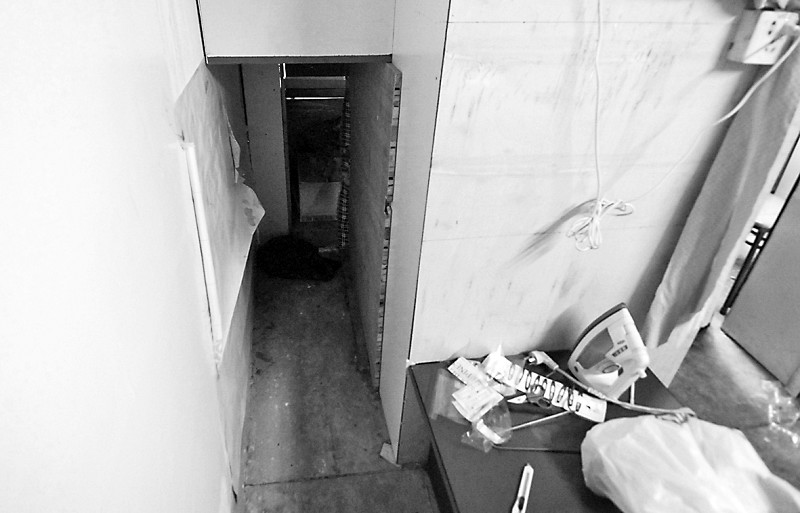 昨天上午,记者随同民警来到这家香烟店。该店门外挂着一块回收香烟的牌子,格外显眼。记者进入香烟店,看到这家店不大,一间店面被隔成了内外室。外面经营,里面住人。在一侧柜台旁的墙上,有一块布帘子,拉开一看,里面是一个与内室相连的暗道,可容一个人爬进爬出。
