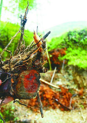 大约又经过了5分钟湿滑泥泞的攀爬,记者来到山顶,看到了令人震惊的一幕,在一个直径约两米、深1米多的大坑里,散落着不少手腕粗的枝干,坑里还有几段被锯断的树根,木质中心部分依然呈现出艳丽的红色。 “虽然搁了这么久,树根还是这么红。”村民拿起一段断根,非常惋惜, “这树本来就不容易存活,弄成这样,恐怕更难活了。”在下山的路上,村民说,现在,他们干活时都会下意识地去看看山顶的几棵树,生怕再给人偷了, “这树珍贵!”