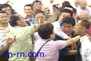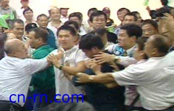 在场采访媒体纷纷向前,打算采访这名呛扁男子,陈水扁就利用这个空档,转身离开会场,和大门口的深绿支持者一一握手道别。