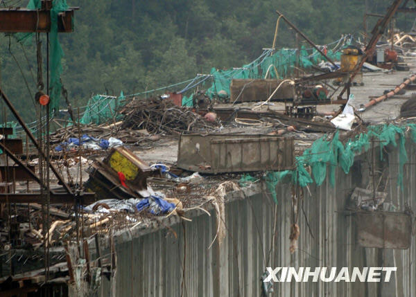 10月29日,发生事故的载人吊斗将桥面上的工地砸得一片狼藉。 新华社记者 刘潺 摄