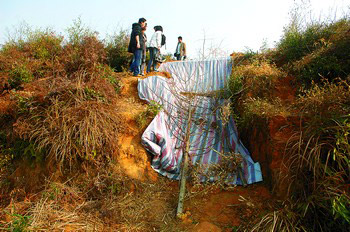 | 昨日,风篷岭二号墓的盗洞已被人用薄膜覆盖,上面还压着一些树枝。均为 陈飞摄 |