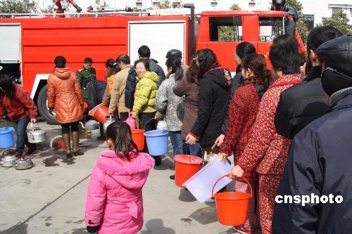 2月20日,江苏盐城市自来水主要取水口受化工污染,城区大面积停水,几十万市民生活饮水告急,出现了抢购纯净水的现象。经当地政府部门紧急处置,到2月21日中午,停水地区供水尚没有完全恢复。事发后,驻地武警部队、消防官兵集中人员组织车辆,向市区人口集中的停水社区有限送水,尽量缓解用水紧张局面,此举受到群众的赞许。据官方人士说,受污染的水源和自来水管网正在做技术处理,以减轻有毒物质的含量,水质要达到完全能饮用的标准并彻底恢复自来水供应,还要有一段时间。中新社发李根摄