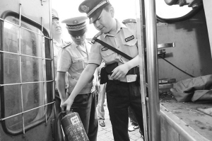 昨天早上9点多钟,记者来到南站广场时,恰逢一列火车到站,许多旅客提着行李等候公交车。市公安局交通治安分局民警和市城管局直属大队执法人员登上一辆1路公交车,依次检查了车内的灭火器、应急逃生锤是否完备,车后门能否手动打开。民警看到一名乘客拎着一个桶,里面还装有不少瓶瓶罐罐,立即上前询问,并提醒说,像摩丝之类的发泡剂不能携带上车,容易受热爆炸。随后,民警拿起应急逃生锤,为乘客现场讲解其用法:锤子两头有尖角,遇到紧急情况时可用它来砸破车窗玻璃逃生。