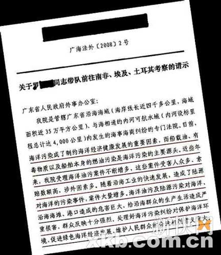 据悉,在出国考察前,海事法院曾向省外事工作办公室请示,请示文件中提到,“近些年来,我院受理海洋油污案件不断增多……为此,我院针对海洋油污及陆源污染问题组织调研,拟接受南非约翰内斯堡市法院、埃及开罗律师协会、土耳其伊斯坦布尔地方法院的邀请……进行为期12天的考察”。考察的主要内容是“油污案件审理过程中对国际公约的理解和执行、海洋污染案件的管辖权……”
