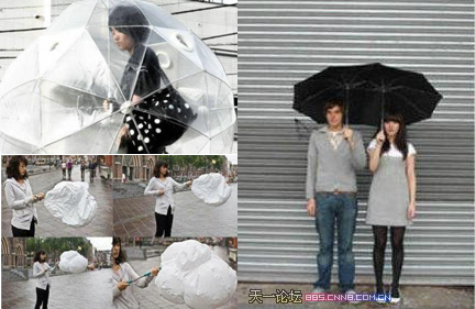 中国宁波网7月5日讯 你的伞可以360度把你围起来,让你彻底淋不到雨吗?你看到过两人共撑的双人伞吗?网友“maj603”在论坛上发帖,让网友们见识到了这些与众不同的伞。也许某个下雨的午后,我们也会在街头看到这样创意十足的伞呢。