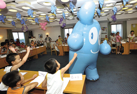 中国宁波网讯 昨天下午,滕头村2009上海世界博览会夏令营活动拉开序幕。主办者通过教孩子们学唱英文歌曲、一起做游戏等方式,向孩子们传授世博会知识、礼仪常识等,进一步拉近了孩子们和世博会的距离。图为孩子们在与上海世博会吉祥物“海宝”做游戏。
