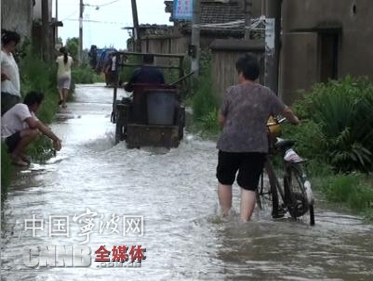 | 姜山镇张村庙村遭遇洪水,进村路段通行困难。 实习记者 高雅 摄 |