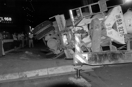昨夜10点40分,记者赶到现场。一辆车牌号为浙BA8276的混凝土专用大货车侧翻在桥面慢车道上,桥面人行道上有一个长约8米、宽约5米、深约1米的大坑,裸露出了钢筋和预制板,看上去十分骇人。两辆大吊车伸着长长的吊臂正在紧张作业。一名吊车司机介绍,因为出事的大货车实在太重了,一辆吊车根本吊不起来。