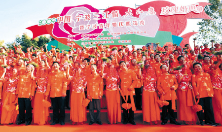 中国宁波网讯 昨天,从海曙区中山广场到江北区老外滩,老宁波十里红妆迎亲场面再现。由团市委、浙江中烟公司共同主办的2009中国宁波三江情大红鹰玫瑰婚典热力上演。来自全国各地的百对新人在美丽甬城结出爱情硕果,给自己留下终生难忘的美好回忆。市政协副主席常敏毅为新人们主婚。