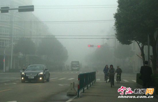 宁海新闻网讯(记者 惠广亮 摄)由于受暖湿气流与辐射降温的影响,昨日早晨浓雾继续驻守缑城,上午8点多,城区还是一片雾蒙蒙的景象,相隔数百米,城区的高楼大厦完全看不清。开车一族也是放慢了车速,记者注意到,许多车辆还开启着灯光在行驶。县气象部门设在城区的检测点显示,昨日早晨我县出现浓雾气象,能见度低于150米,为近几日大雾天里能见度最低。未来几天还会出现这样的浓雾的天气吗?县气象部门的工作人员称,27日早晨还会有雾,28日因为有个弱降水过程,大雾将不会出现。