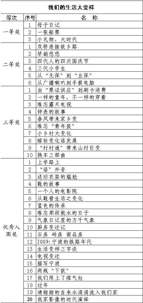 在宁波市政府新闻办(网宣办)指导下,中国宁波网组织举办了“我们的生活大变样”网上征文、网络文明公益宣传创意大赛、“辉煌60年□和美宁波”Flash动画设计制作大赛、城市形象网络公益广告创意大赛四项活动。作为第二届宁波网络文化节的主体活动,四项活动的评选经网友作品报送、网上作品选登和专家综合评审,在面向社会公示和检查核对的基础上,产生了以下获奖作品,现予以公布。