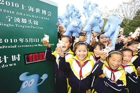 高2.5米、宽1米的迎世博倒计时牌在滕头村音乐喷泉广场竖起,海宝与游客们跳起了欢快的舞蹈,象征梦想的和平鸽在这里放飞……今天是上海世博倒计时一百天。昨天,奉化滕头村民以各种形式激情“点燃”世博梦想——“乡村,让城市更向往”。在活动现场,小学生们手持彩笔,绘出心中的世博;十几名妇女则以年糕为原料,制作形态各异的海宝。今天,迎世博腰鼓舞大比拼、村民外语秀等活动还将陆续举行。(记者 严 龙 王红雨 徐猛挺 摄)
