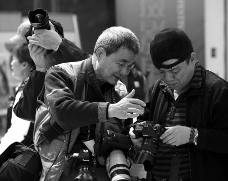 图为“阿拉摄影节”开幕式上,摄影爱好者在相互交流。 (严 龙 朱军备 朱华红 摄)