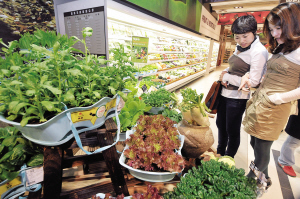 昨天,一家名叫Ole的高端超市在和义大道购物中心地下一层开业。在超市入口处,一盆盆郁郁葱葱的有机青菜、生菜等绿叶蔬菜格外引人注目。这种售价29.80元/盆的蔬菜带盆卖,顾客买回家后想吃了可以随时收割,割了以后只要浇水,还会再长出两到三茬蔬菜。
