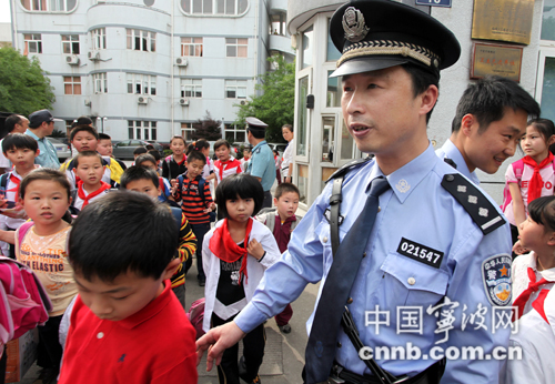 中国宁波网5月7日讯(宁网播报员 朱尹莹)近日,海曙公安分局鼓楼派出所民警和协警正在孝闻小学校门口执勤。为切实增强校园及周边地域安全系数,该分局严格落实外来人员进校登记查检、辖区民警在学生出入校门高峰期巡逻执勤制度,并把警棍、催泪喷射器等防护装备配置到位,同时组织开展校园保安培训工作,坚决遏制涉及学生人身安全的重大案件发生。