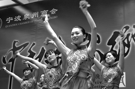 “举杯邀明月,共谱团圆曲。”昨晚,旨在为促进宁波与泉州两地经济发展发挥桥梁纽带作用的宁波泉州商会,遍邀会员举办了一场“中秋月,家乡情”联欢晚会,共同话家乡,庆团圆,迎中秋。图为晚会上的文艺表演。
