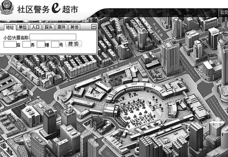 打开“社区警务e超市”的平台可以看到:准三维彩色的社区、商务楼宇、道路、广场逼真呈现,整个海曙区城市面貌在这里得到微缩景观式的复原。随着鼠标的拖拽,相应楼房的入驻单位、居住人员等相关信息立即显现出来;点击进入楼房,每间房子中的人员和单位信息及相关图文资料一并显现。截至目前,“社区警务e超市”已建成虚拟房屋6800余幢、虚拟房间15万余间,导入人口数据127万余条、单位数据2.7万余条。