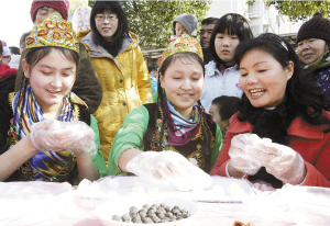 少数民族学生学包汤圆。记者 徐文杰 摄