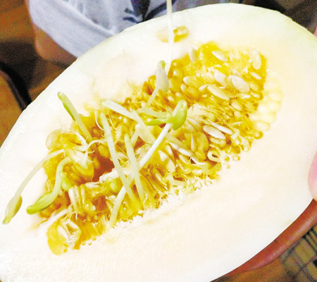 据了解,两只“发芽瓜”系同一品种,名为“东方蜜瓜”。马老板说:“我们原来在老家种地的时候也遇到过这样的情况,不稀奇。不过这样发芽的瓜比正常瓜苦,估计没人会喜欢吃的。”