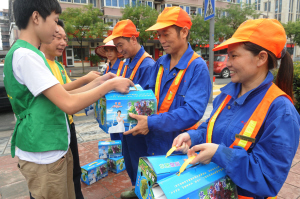 昨天上午,在宁波爱心同盟的促成下,爱心市民“小李姐姐”出资购买了2.5公斤装的葡萄40箱,送给在江北人民路和槐树路上清扫的环卫工人。“小李姐姐”说,这样做既帮助了葡萄种植户,又慰问了辛苦在一线的环卫工人。记者龚国荣