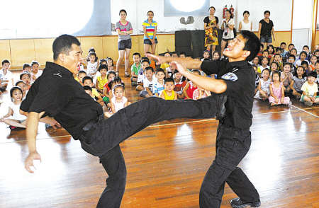 连日来,海曙巡特警队员走进辖区各小学,通过安全教育活动和防范训练展示,提高新生的自我保护意识和能力。图为特警叔叔正在向海曙中心小学新生展示真功夫。(宁波日报 胡建华 陈栋 邵琦 摄)