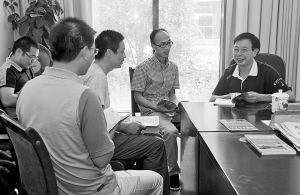 裘尧伟(右一)向政府工作人员介绍调解经验。 徐佳伟/摄